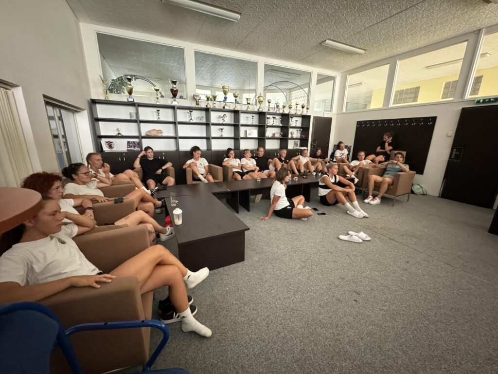 V pondelok sme sa zamerali na tímový koučing, kde sme spoločne preberali záťažové situácie, ktoré hráčky počas svojich zápasov a tréningov zažívajú. Spoločne sme hľadali efektívne riešenia a stratégie na ich zvládnutie. Hráčky sa aktívne zapájali do diskusie a delili sa o svoje osobné skúsenosti, čo prispelo k otvorenej a dôvernej atmosfére. - Analýza tréningového procesu